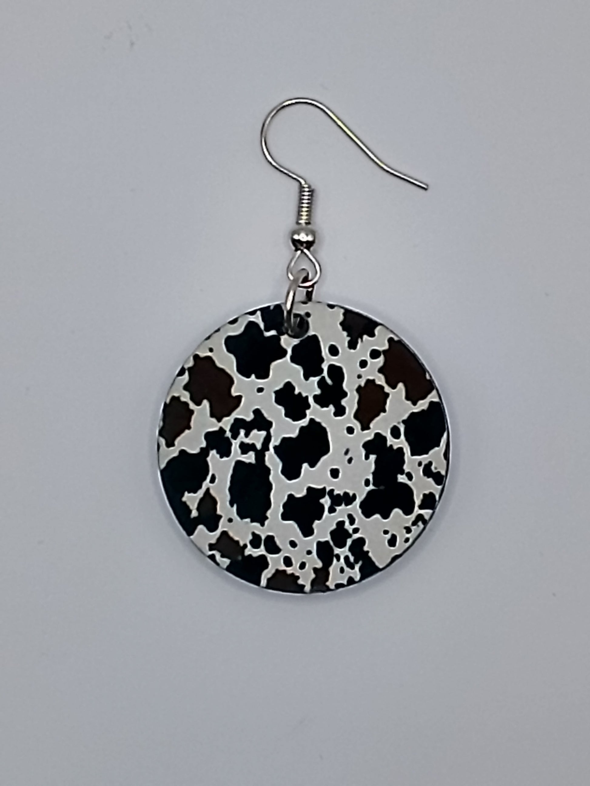 Each pair features a classic brown and black cow print pattern—irregular patches of rich chocolate brown and deep black on a light neutral background, creating an authentic animal hide look with a rustic, farmhouse edge. This timeless cowhide design is perfect for adding a touch of country charm and wild spirit to your everyday outfits.